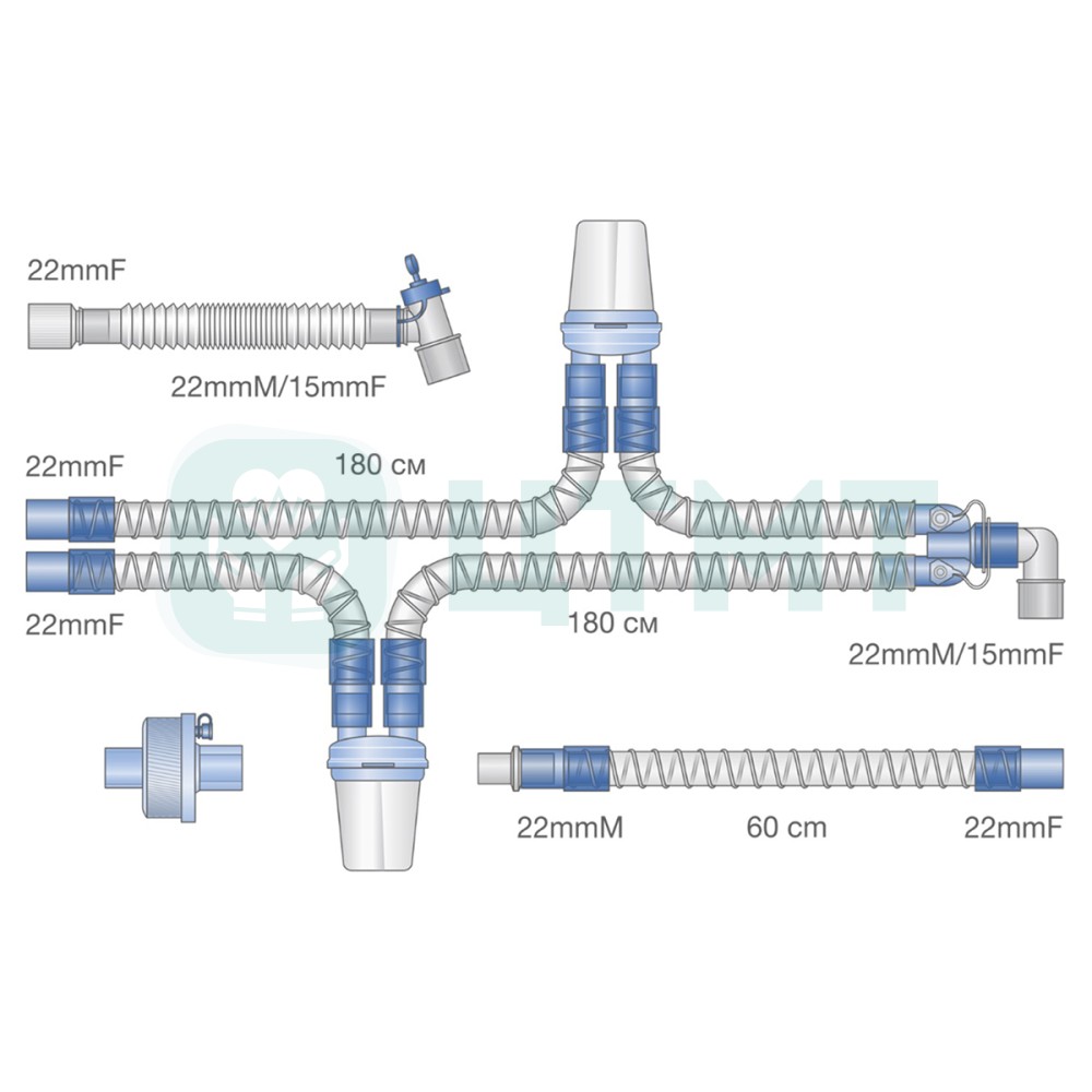 • Контур дыхательный для ИВЛ гладкоствольный 22 мм 180 см с 2-мя влагосборниками, фильтром, коннектором угловым конфигурируемым с портом для бронхоскоп