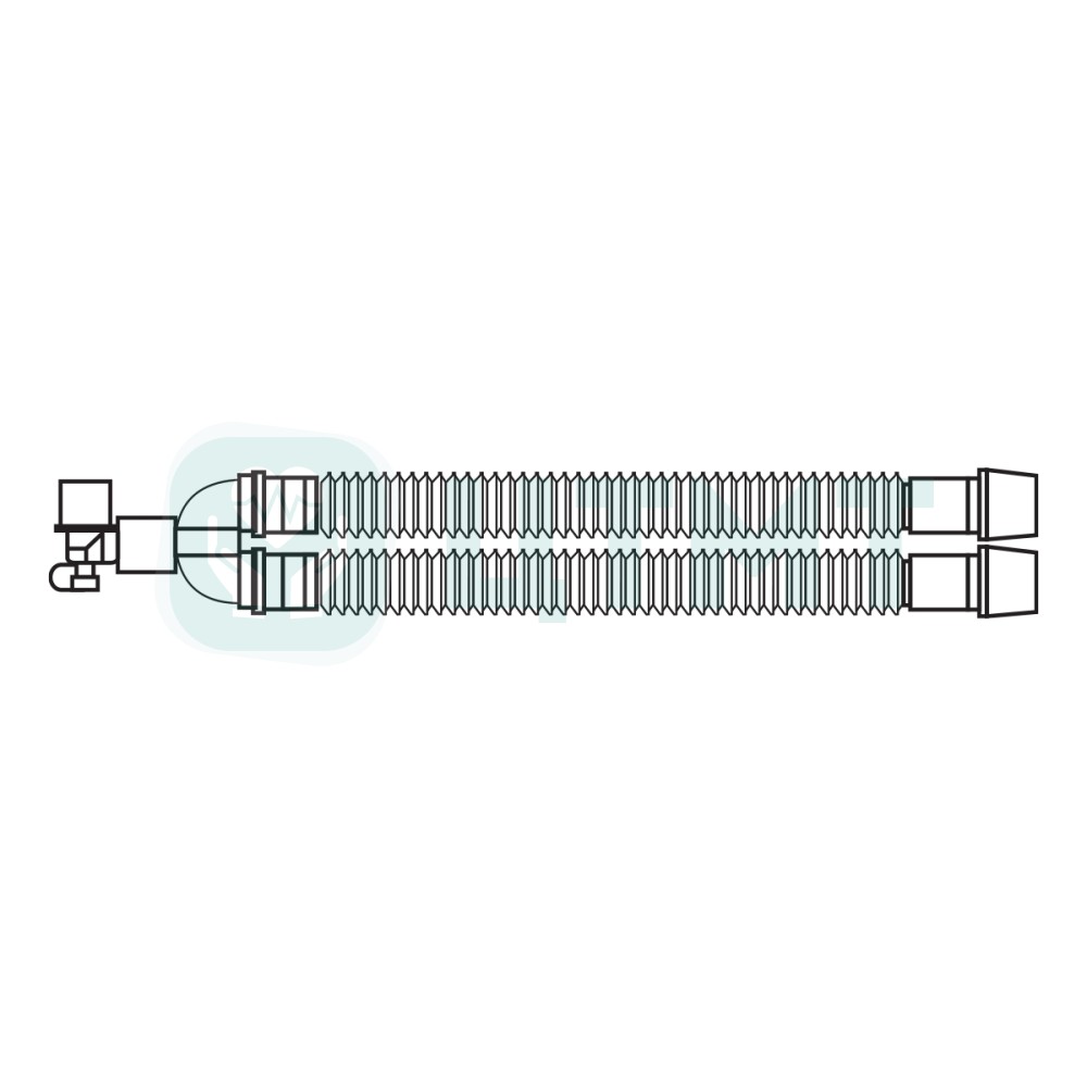 Изготовлен из прозрачного растяжимого полипропилена и полиэтилена, устойчивого к перегибу, D = 22 мм. Длина 53-160 см, встроенный со стороны пациента угловой коннектор с СО2 портом и разъемом 22М/15F с защитной крышкой и коннекторы со стороны аппарата с разъемом 22F.