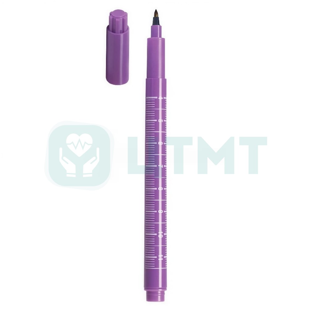 Стерильный хирургический маркер одноразового использования служит для нанесения разметки предполагаемой линии хирургического разреза на коже, а также для корректировки контуров в пластической хирургии, ортопедии и других медицинских дисциплинах. Чернила на спиртовой основе фиолетового цвета (на базе генциан-виолета) быстро высыхают, не токсичны, не вызывают раздражения кожи и обладают антибактериальными свойствами.