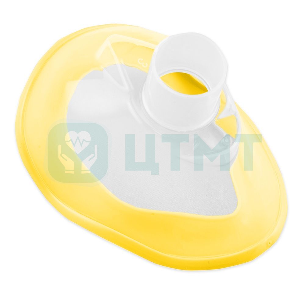 Для проведения ингаляционной анестезии на фоне самостоятельного дыхания и/или вспомогательной и принудительной вентиляции легких. Изготовлена из жесткого прозрачного пластика анатомической формы с мягкой нераздувной манжетой желтого цвета по периметру маски.