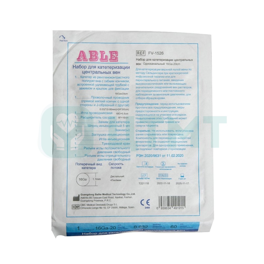 Стерильный набор ABLE FV-1526 предназначен для одноразовой катетеризации центральных вен с целью инфузии и аспирации.