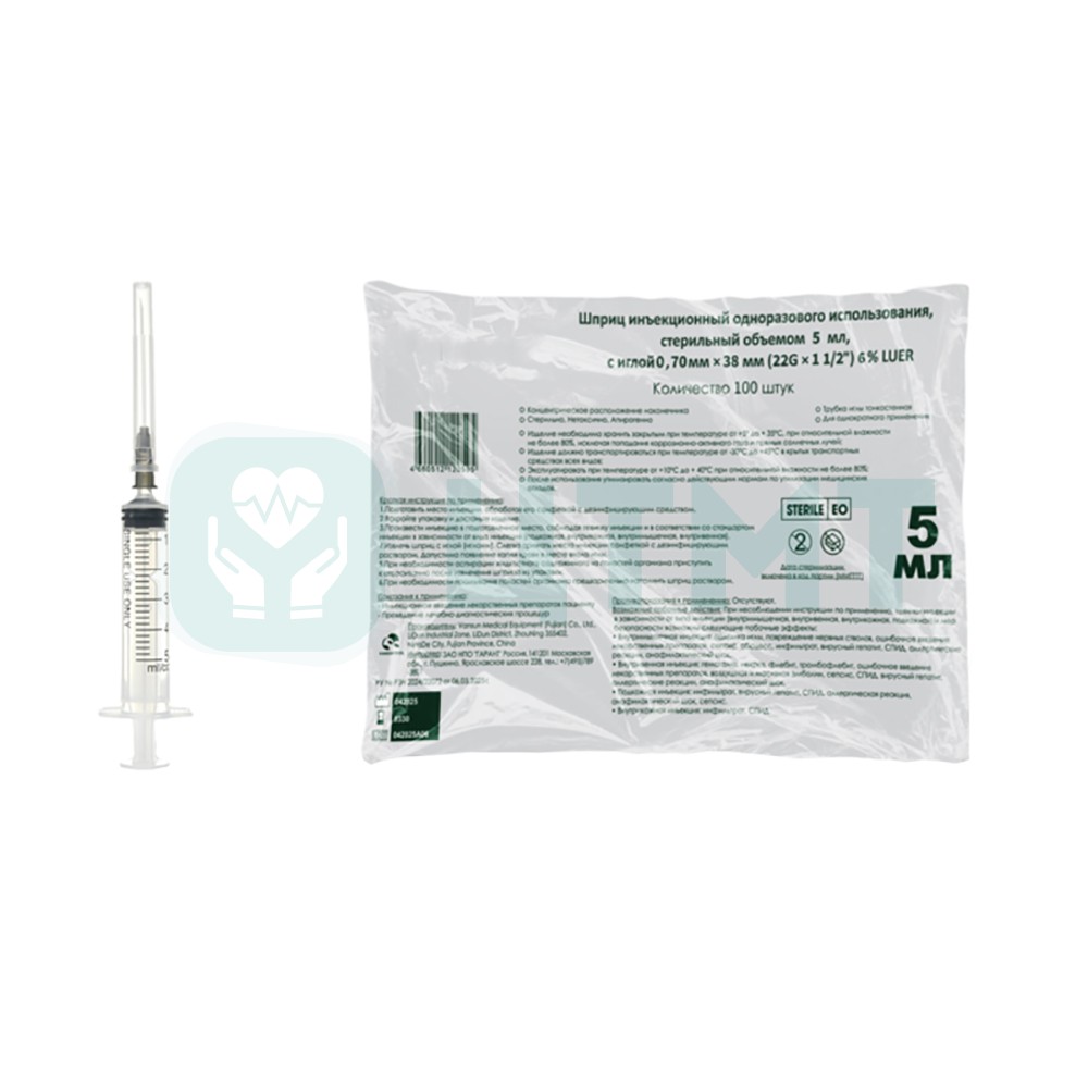 • Шприц 5мл. (3-х) с надетой иглой 0,7 x 38 - 22G