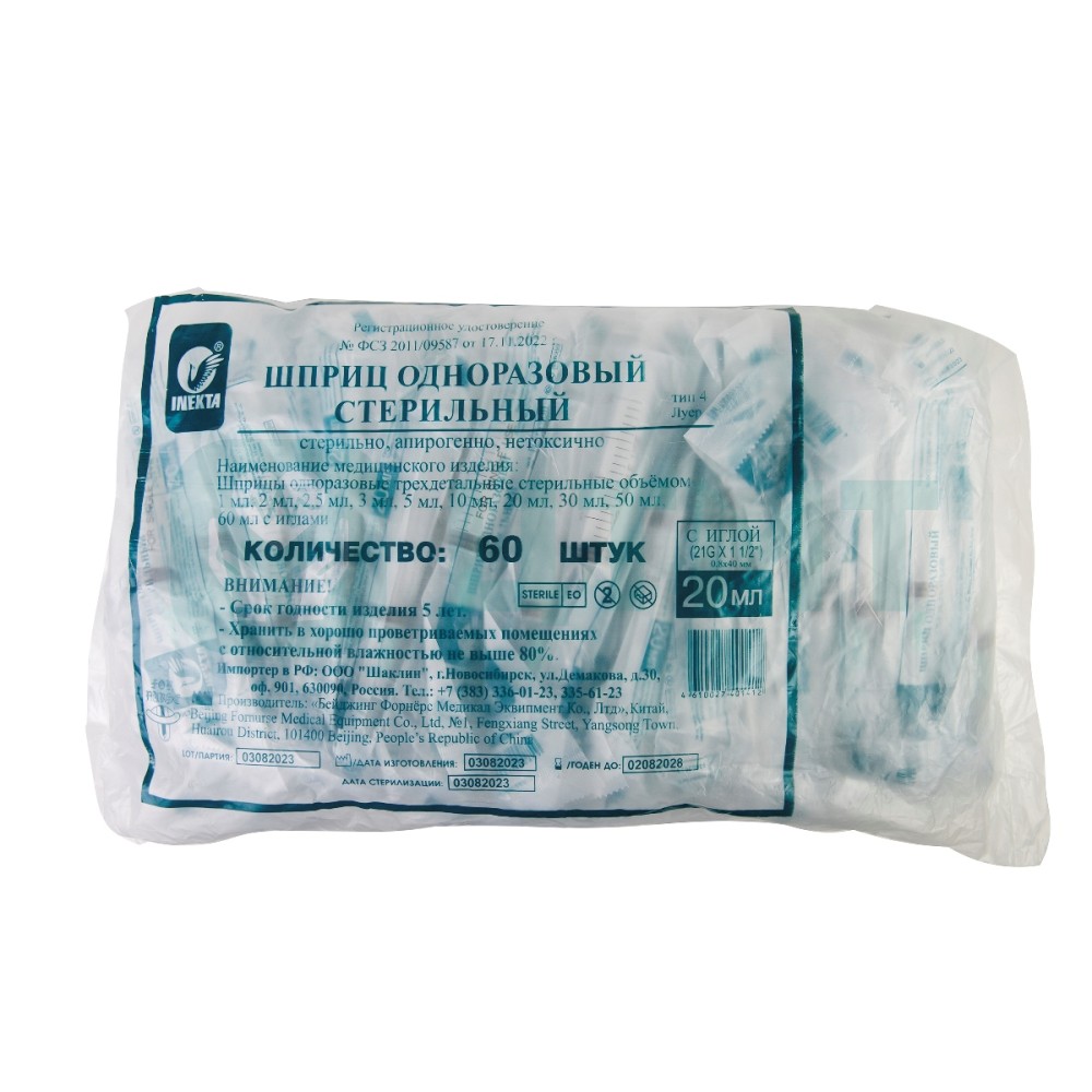 Шприцы одноразовые трехдетальные стерильные объёмом 20 мл с иглами 0.00 ₽ / шт